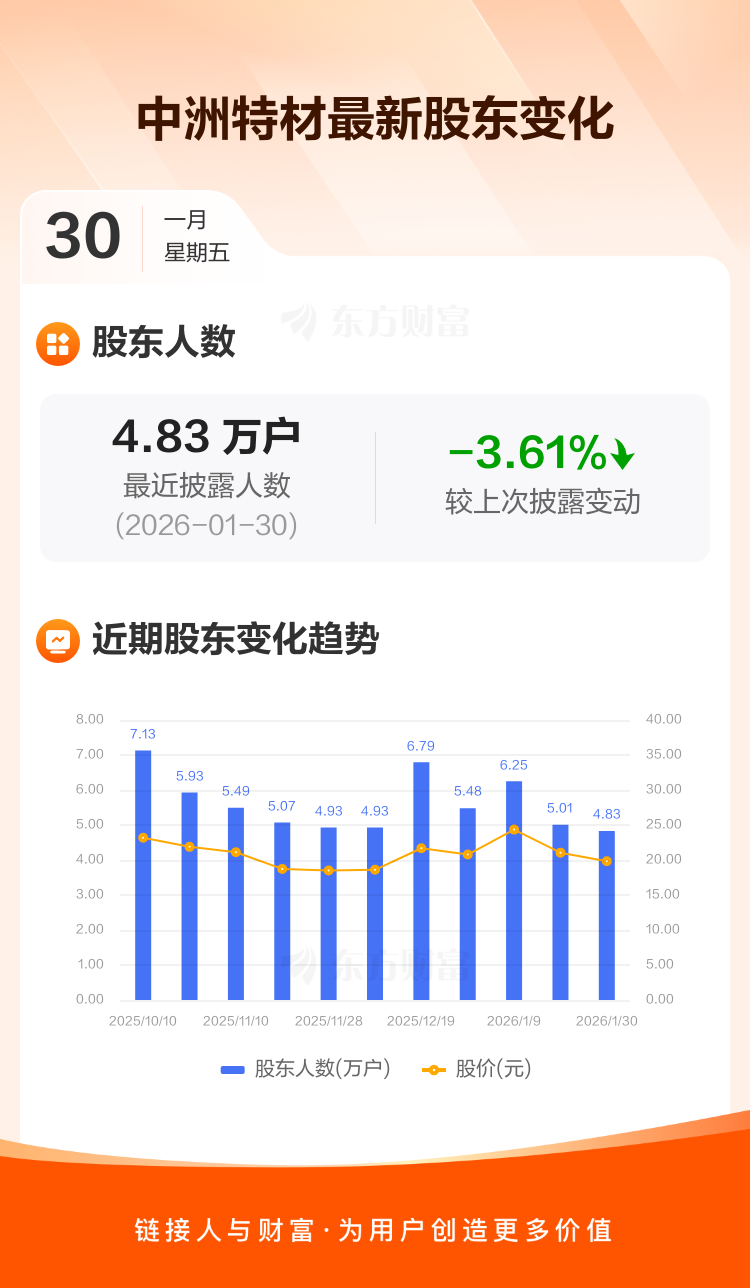 中洲特材最新披露数据显示,截至1月30日公司股东户数为4.83万户,较上期(2026年1月20日)减少1808户,降幅为3.61%。户均持有流通股数量由上期的5777股上升至5993股,户均持股金额由上期的12.16万元减少至11.87万元。