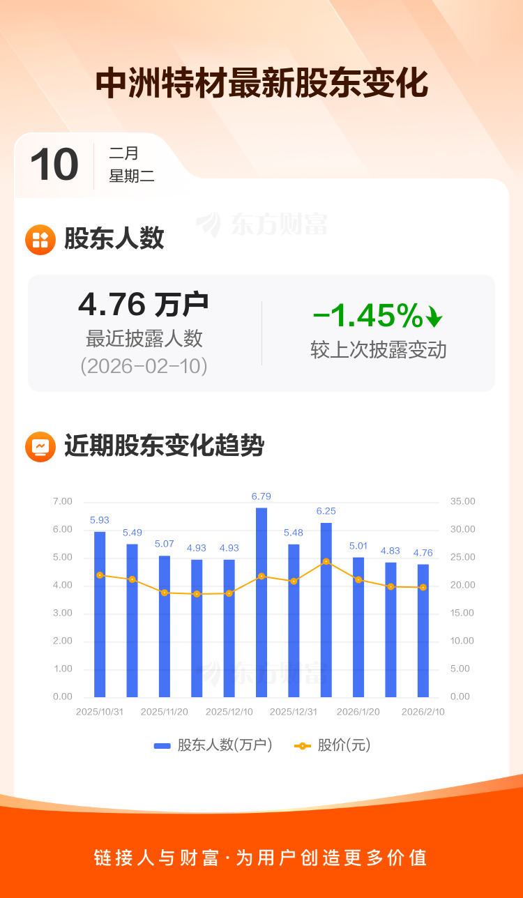 中洲特材最新披露数据显示,截至2月10日公司股东户数为4.76万户,较上期(2026年1月30日)减少699户,降幅为1.45%。户均持有流通股数量由上期的5993股上升至6081股,户均持股金额由上期的11.87万元增加至11.97万元。