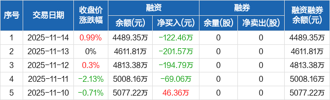 融资方面,当日融资买入834.46万元,融资偿还956.92万元,融资净偿还122.46万元,连续4日净偿还累计587.88万元。融券方面,融券卖出0股,融券偿还0股,融券余量0股,融券余额0元。融资融券余额合计4489.35万元。