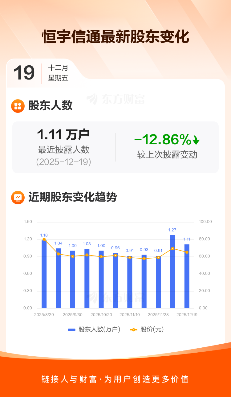 恒宇信通最新披露数据显示,截至12月19日公司股东户数为1.11万户,较上期(2025年12月10日)减少1632户,降幅为12.86%。户均持有流通股数量由上期的4388股上升至5036股,户均持股金额由上期的30.36万元增加至32.71万元。
