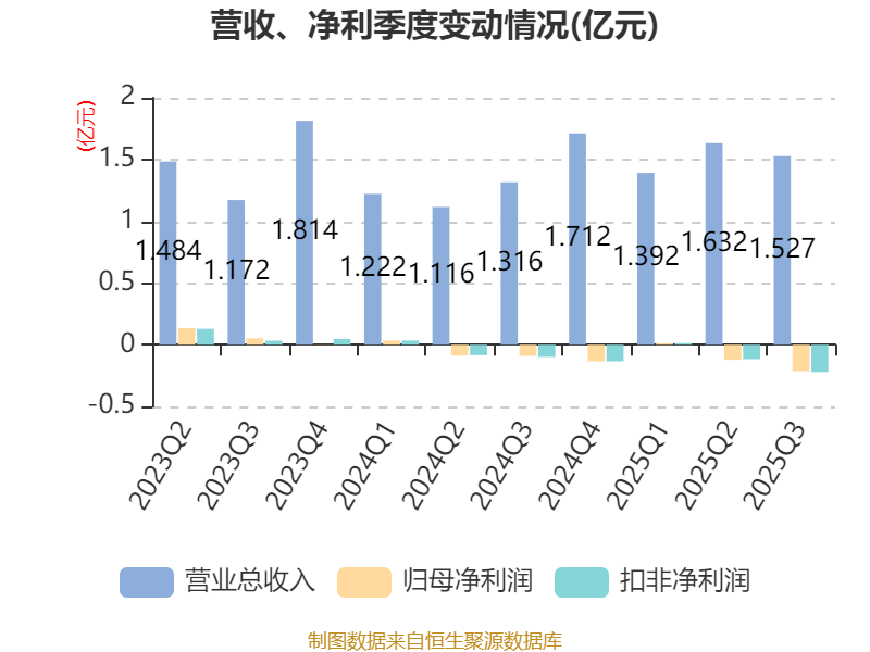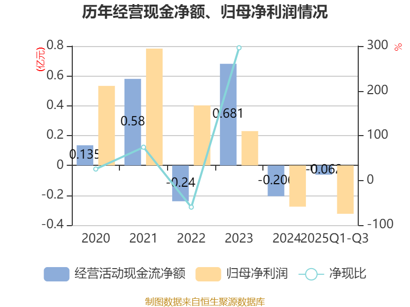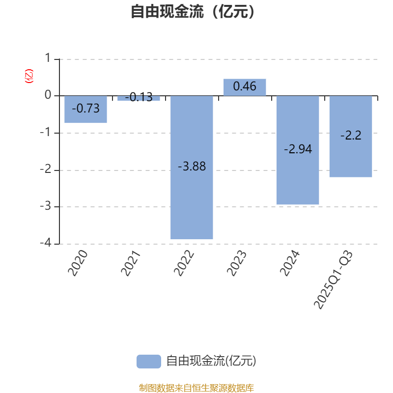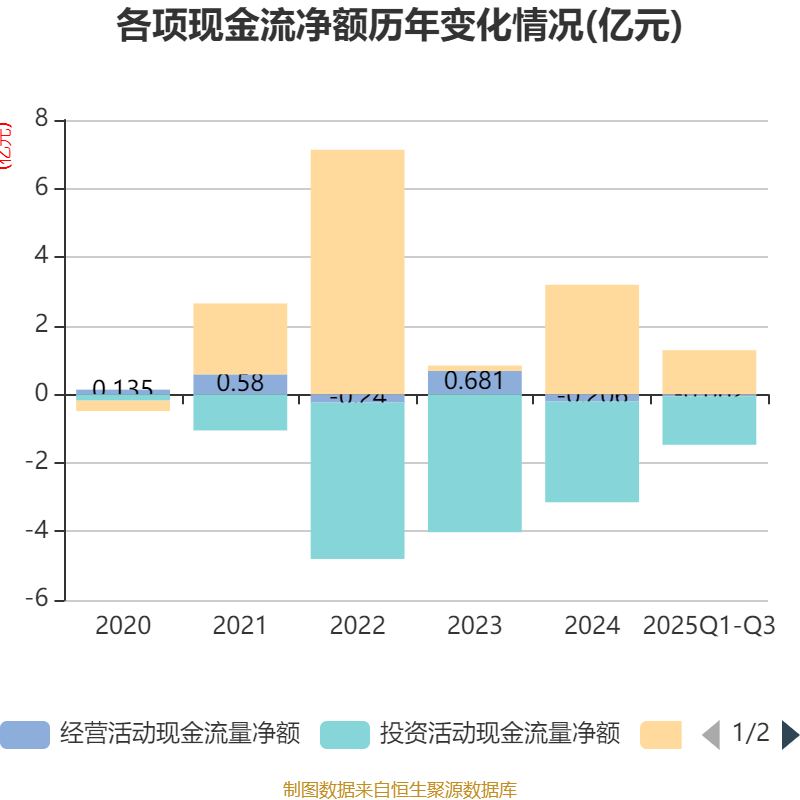 2025年前三季度,公司经营活动现金流净额为-616.6万元,同比减少9944.24万元;筹资活动现金流净额1.29亿元,同比减少9130.99万元;投资活动现金流净额-1.41亿元,上年同期为-3.29亿元。
