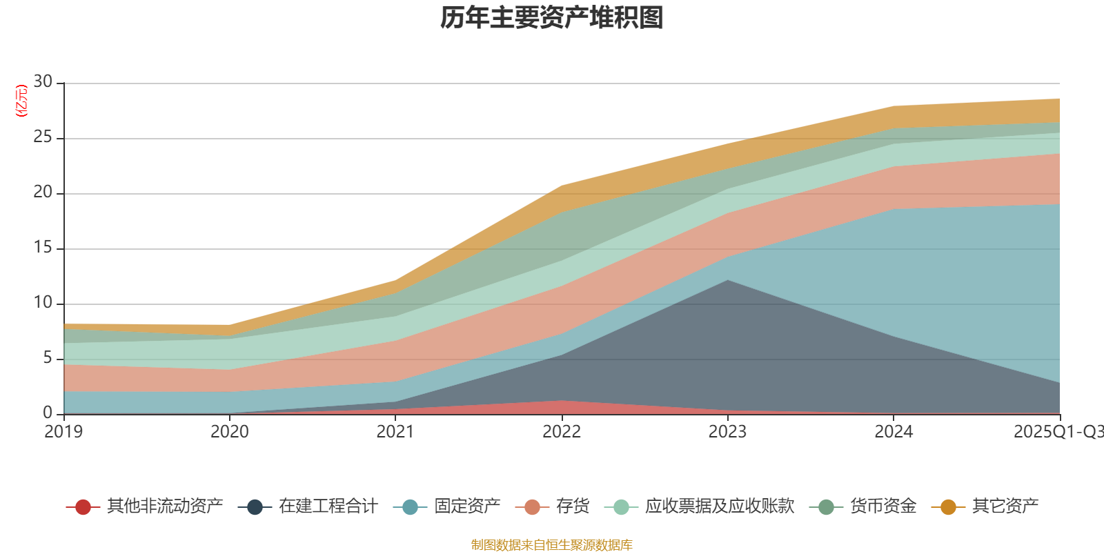 资产重大变化方面,截至2025年三季度末,公司在建工程合计较上年末减少60.56%,占公司总资产比重下降15.3个百分点;固定资产较上年末增加40.04%,占公司总资产比重上升15.21个百分点;存货较上年末增加19.57%,占公司总资产比重上升2.31个百分点;货币资金较上年末减少32.95%,占公司总资产比重下降1.75个百分点。