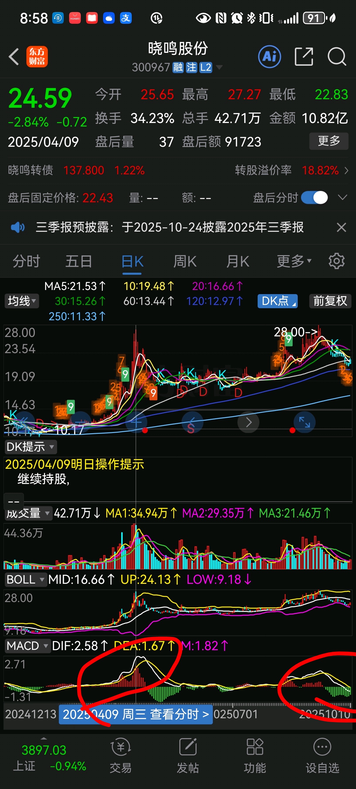 现在经过半年大牛市,许多票三倍五倍十倍后,晓鸣股份MAcD技术位置在底部