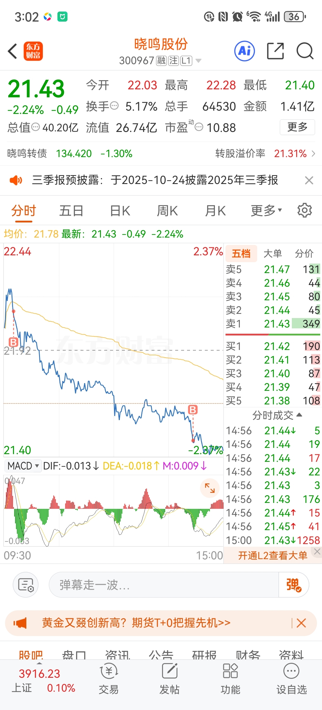 $晓鸣股份(SZ300967)$ 一步错,步步错。周一只卖了半仓,搞的我天天跌,天天补,还好今天守住了21.40,明天再跌就全部清了,亏麻了