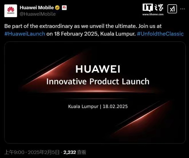 华为手机将于 2 月 18 日在马来西亚吉隆坡举行海外发布会。
