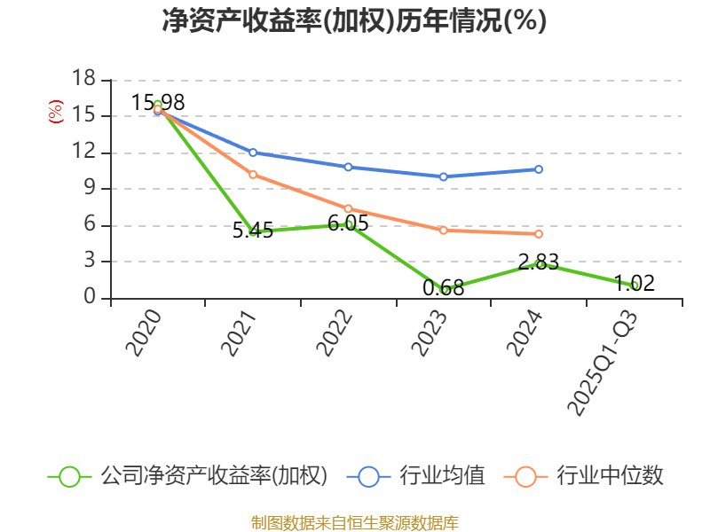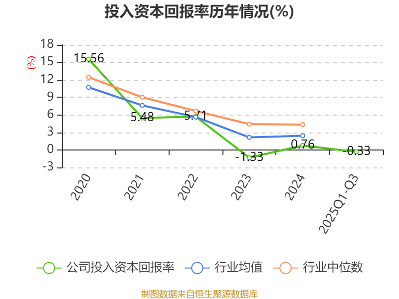 盈利能力方面, 2025年前三季度公司加权平均净资产收益率为1.02%,同比下降1.5个百分点。公司2025年前三季度投入资本回报率为-0.33%,较上年同期下降1.34个百分点。