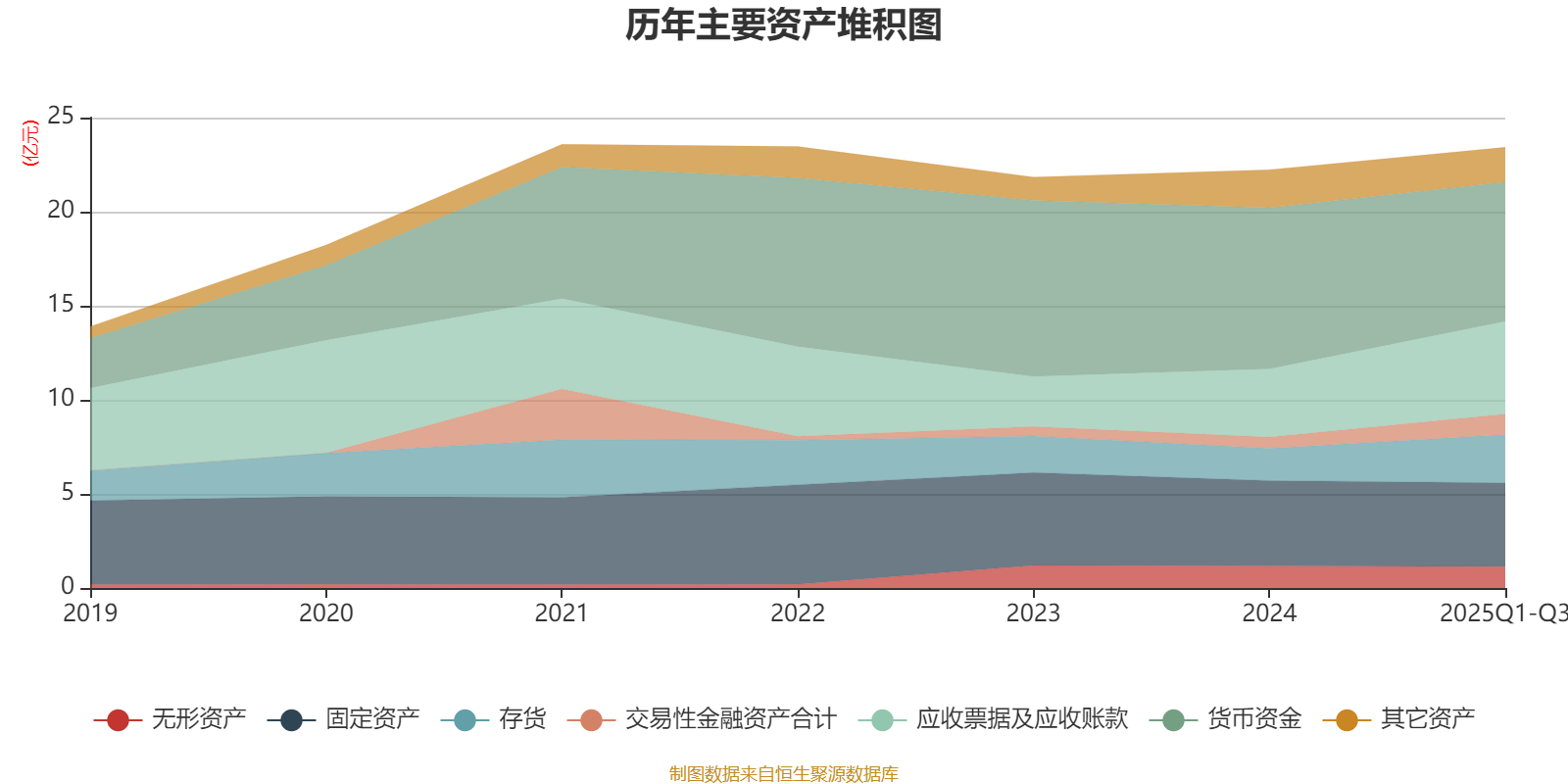 资产重大变化方面,截至2025年三季度末,公司货币资金较上年末减少13.52%,占公司总资产比重下降6.9个百分点;应收票据及应收账款较上年末增加36.2%,占公司总资产比重上升4.76个百分点;存货较上年末增加49.29%,占公司总资产比重上升3.22个百分点;交易性金融资产合计较上年末增加83.02%,占公司总资产比重上升1.99个百分点。