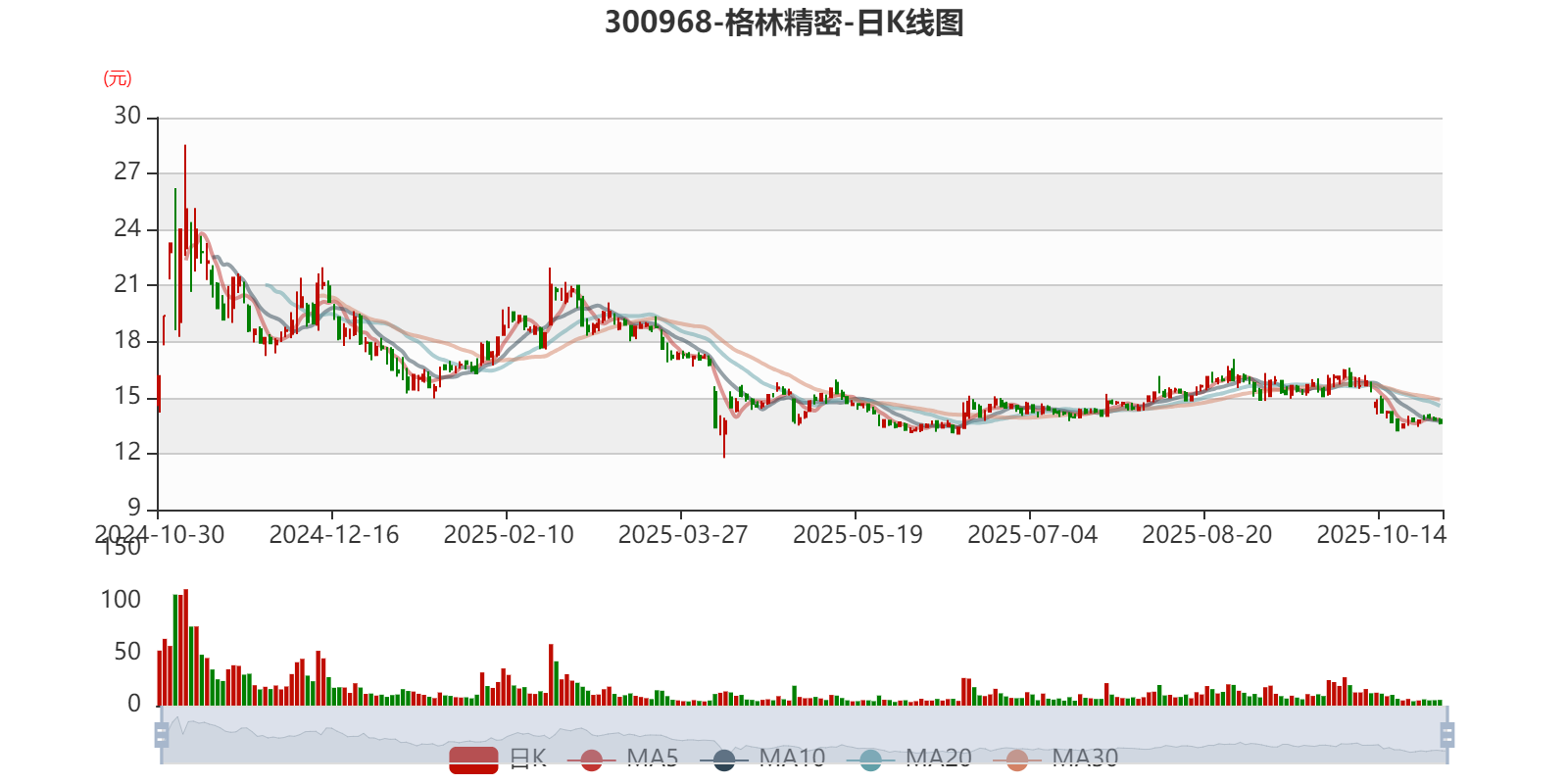以10月29日收盘价计算,格林精密目前市盈率(TTM)约为223.81倍,市净率(LF)约2.97倍,市销率(TTM)约4.4倍。