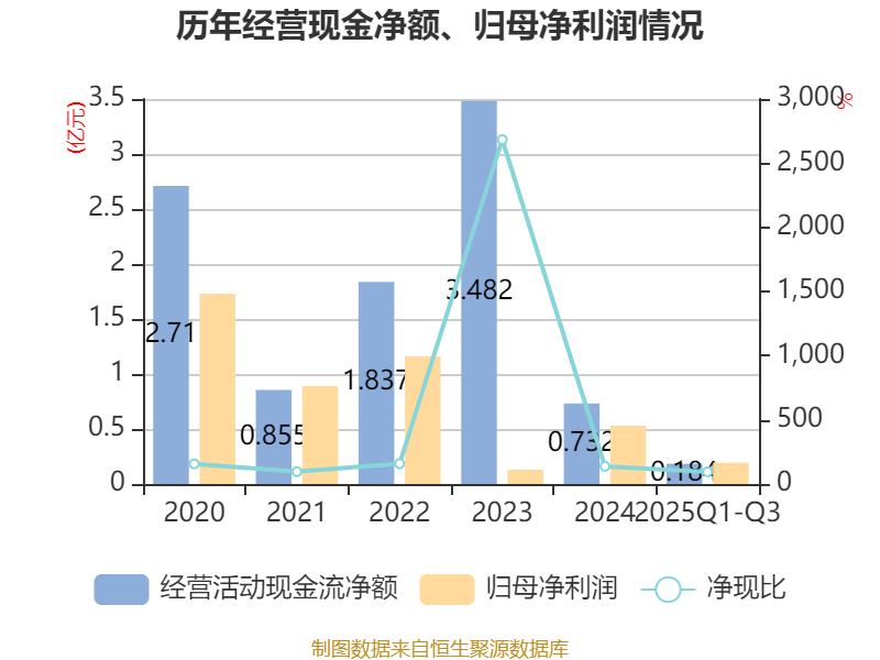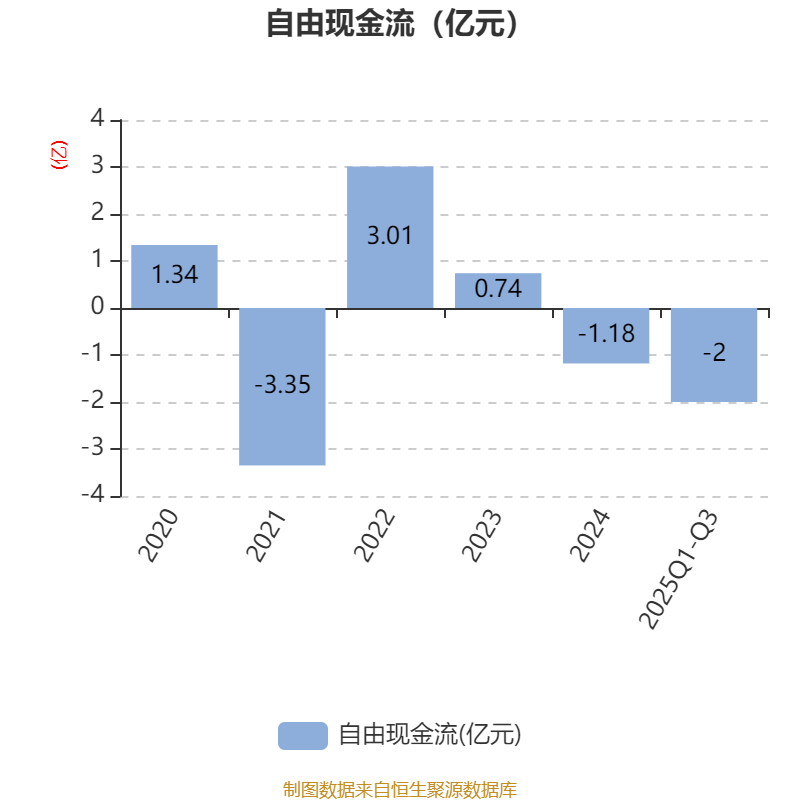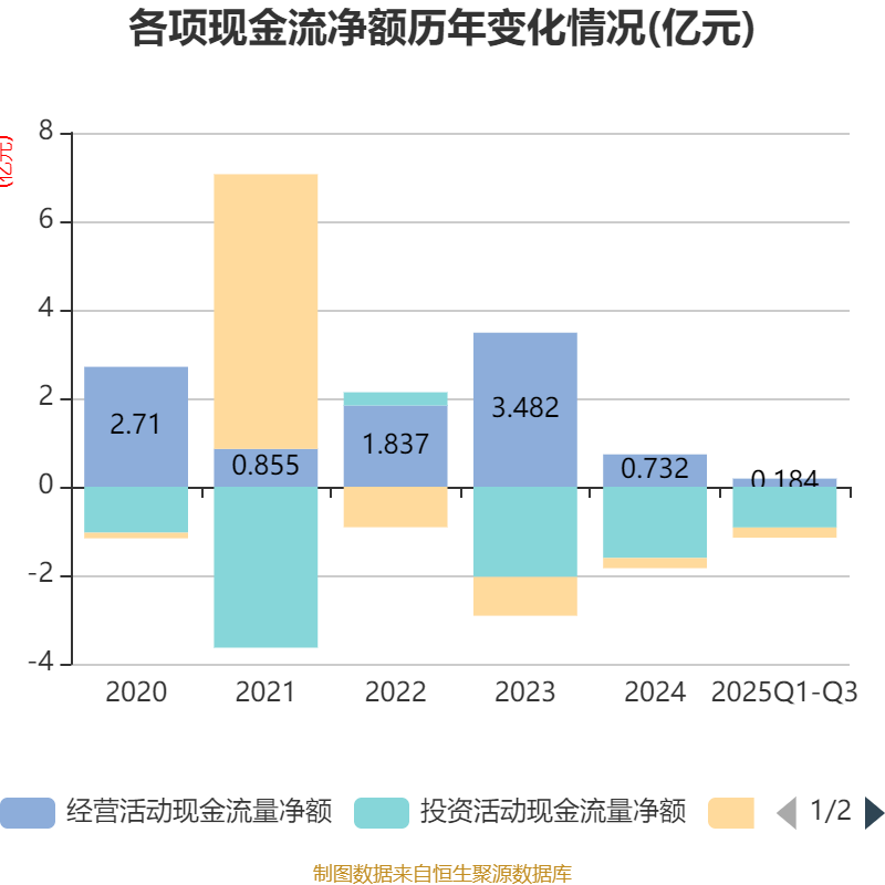 2025年前三季度,公司经营活动现金流净额为1841.26万元,同比下降42.06%;筹资活动现金流净额-2307.62万元,同比减少9142.53元;投资活动现金流净额-9206.45万元,上年同期为-5320.08万元。