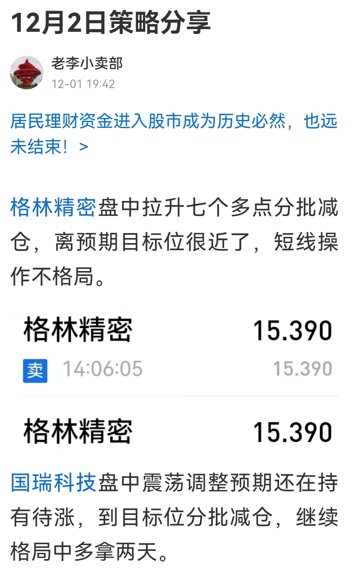 $格林精密(SZ300968)$ 盘中拉升七个多点分批减仓,明天冲高16减详见2日策略分享