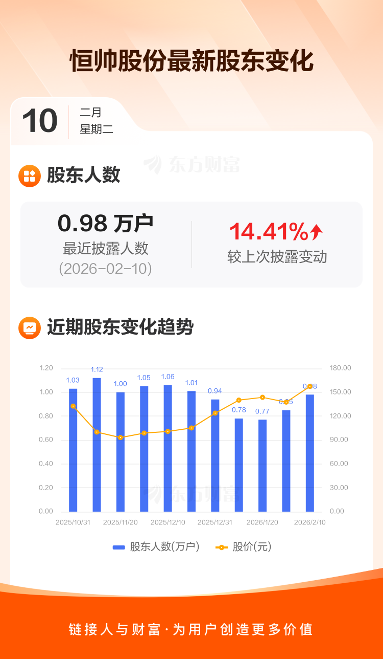 恒帅股份最新披露数据显示,截至2月10日公司股东户数为9768户,较上期(2026年1月30日)增加1230户,增幅为14.41%。户均持有流通股数量由上期的5886股下降至5145股,户均持股金额由上期的80.99万元减少至80.94万元。