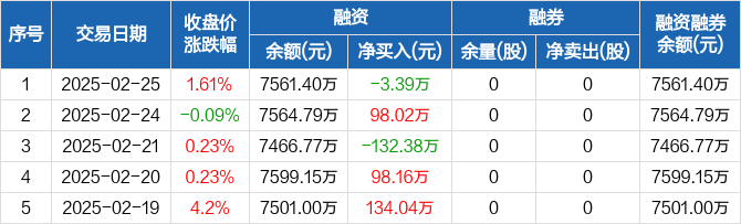 博亚精工:融资净偿还3.39万元,融资余额7561.4万元(02-25)
