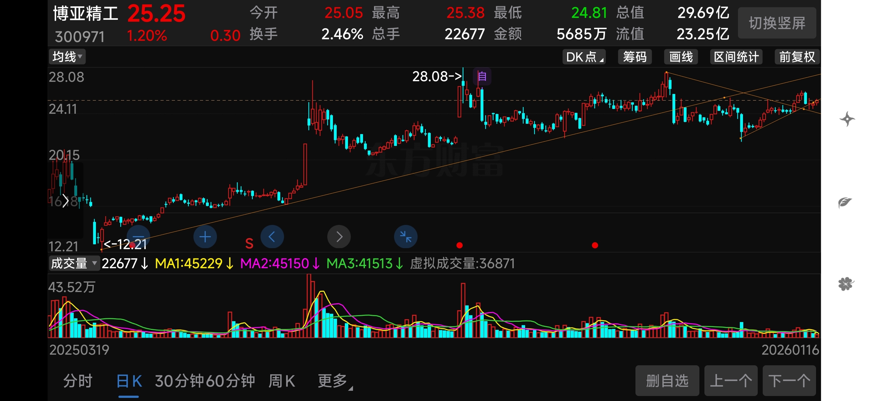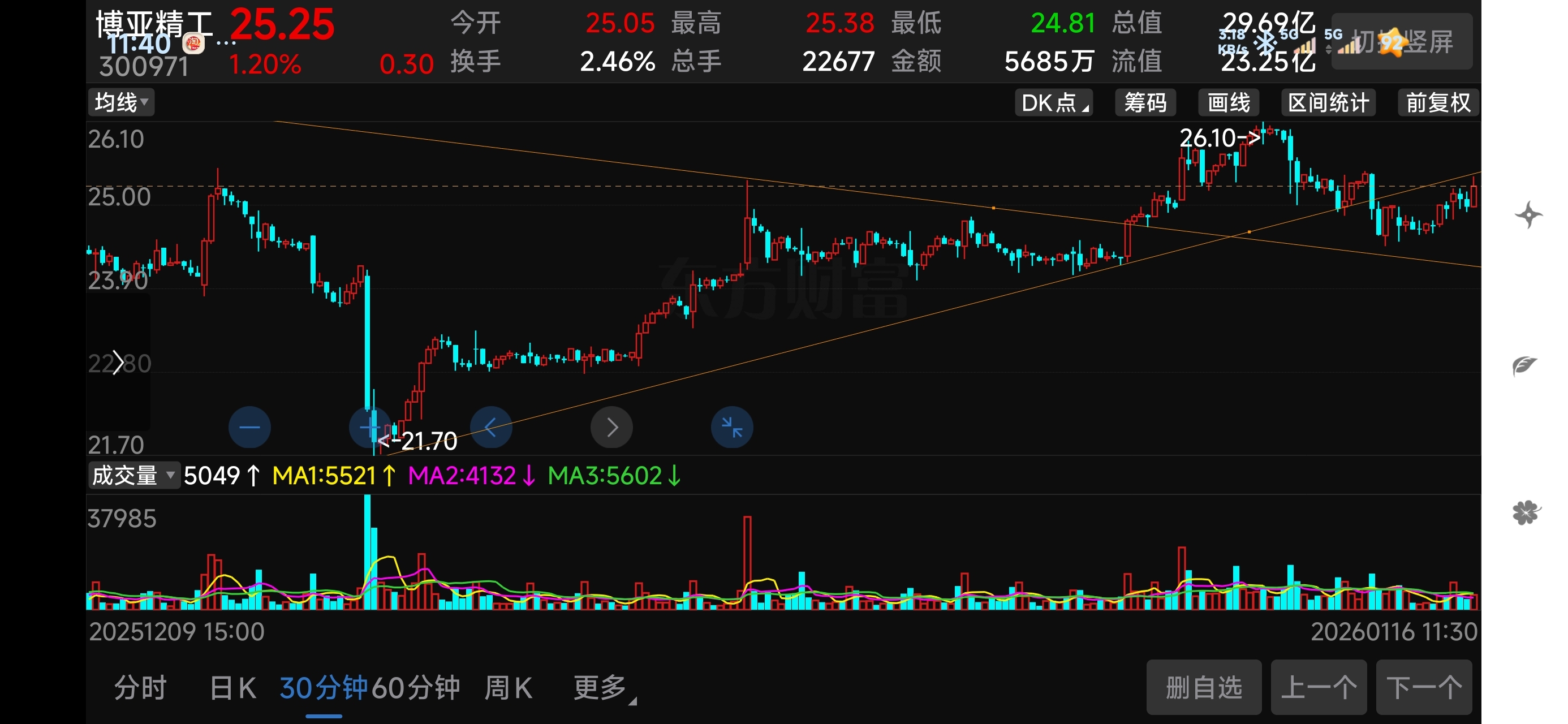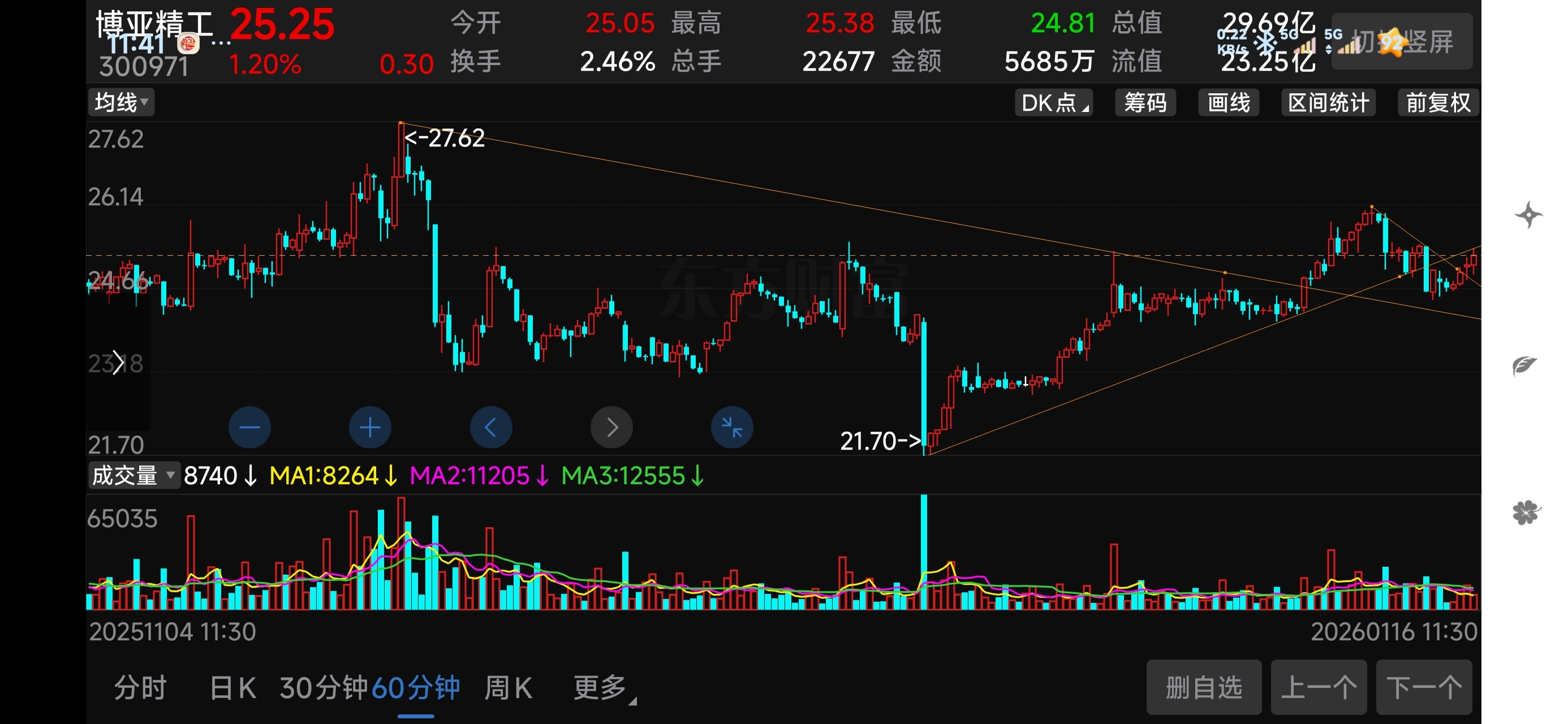 $25.40左右是日线,30分钟,60分钟上升通道下轨压力线。下午是否能站稳?