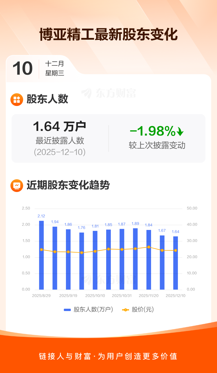 博亚精工:截至12月10日最新股东户数1.64万户,较上期减少1.98%