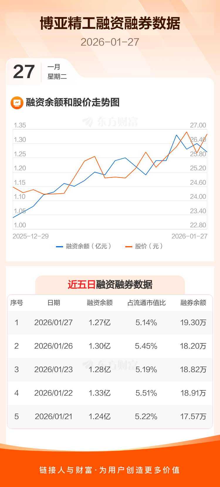 交易所最新数据显示,博亚精工于2026年1月27日获融资买入2330.61万元,融资偿还2703.60万元,当日融资净偿还372.99万元。目前,该股融资余额1.27亿,占流通市值比例为5.14%。