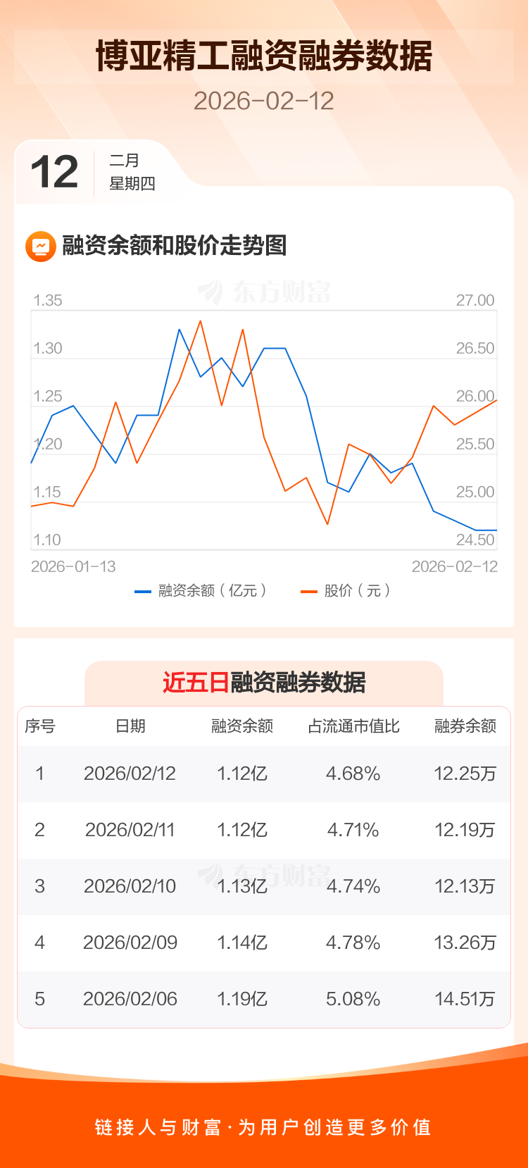 交易所最新数据显示,博亚精工于2026年2月12日获融资买入756.15万元,融资偿还782.21万元,当日融资净偿还26.05万元。目前,该股融资余额1.12亿,占流通市值比例为4.68%。