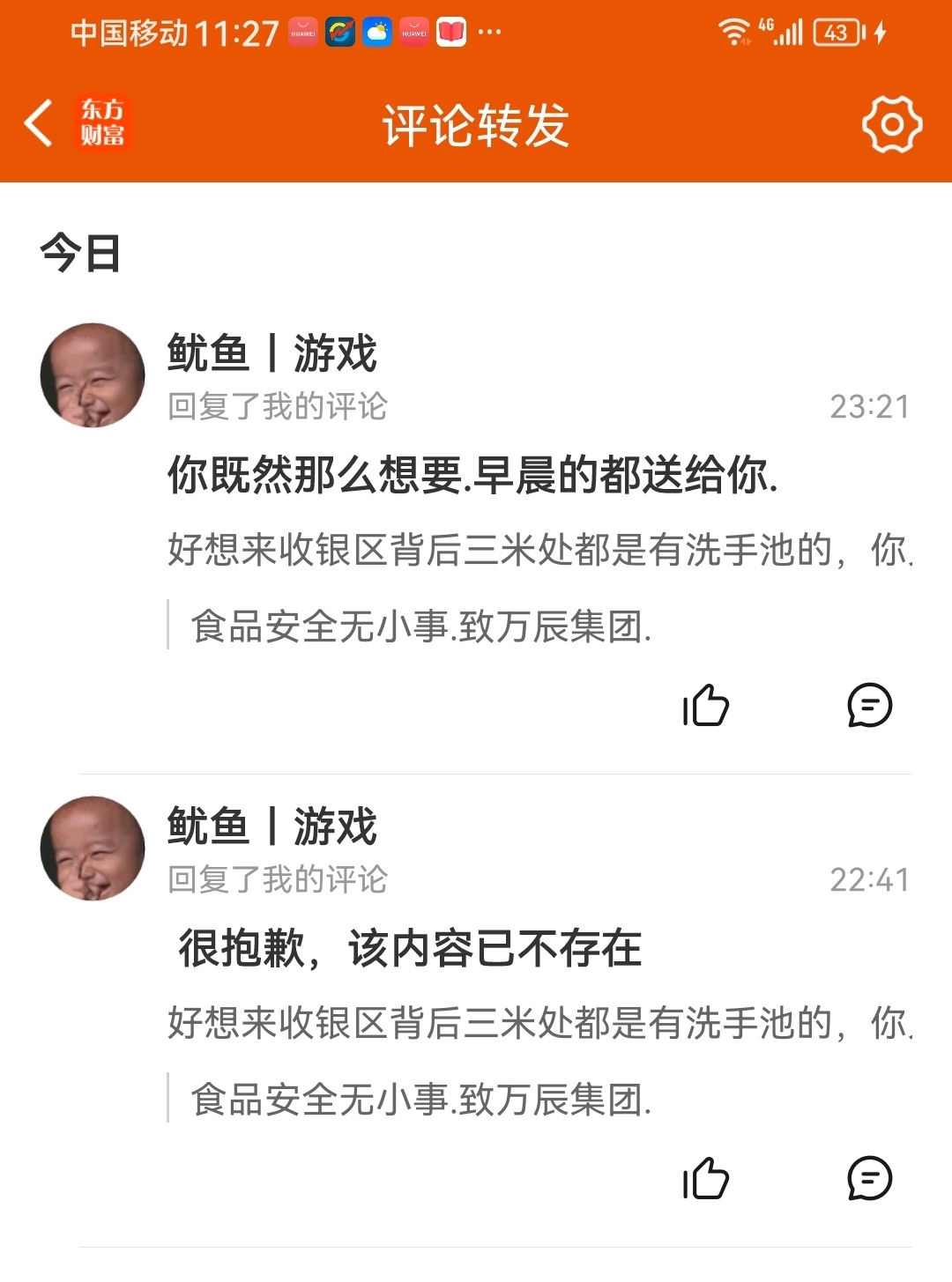 $万辰集团(SZ300972)$ 这孙子跟我玩战术,我没拉黑它,一直等着它,它孙子怼我一句,然后马上拉黑我,这孙子是我这么多年股吧遇到的第一位。这孙子吃多了,嘴真Tm臭。