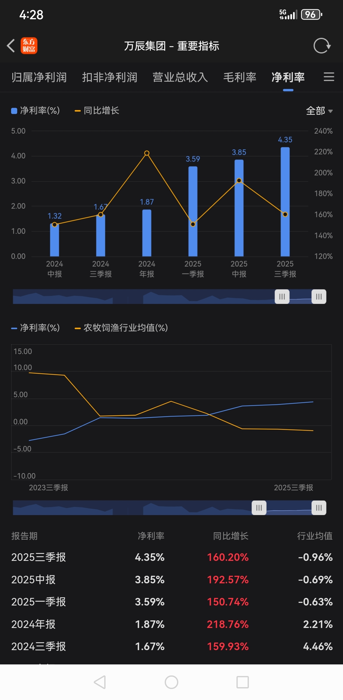 $万辰集团(SZ300972)$ 万辰集团:20万辰集团的毛利率上升得很快,几乎所有券商的投研报告都没考虑毛利率的上升带来净利润率的上升 。从下图可以看出:2024年中报净利润率才1.32%,2025年三季报净利润率高达4.35%。短短一年时间,净利润率提升3个百分点。2025年毛利率为12.5%左右,净利润率为5%左右。随着自营品牌商品自2025年9月逐步推出,预计2026年的毛利率将提升到15%,净利润率相应提升到7.5%;2027年毛利率将提升到17.5,净利润率提升到10%。也就是说:2027年营收若达到1200亿元,净利润将达到120亿元。