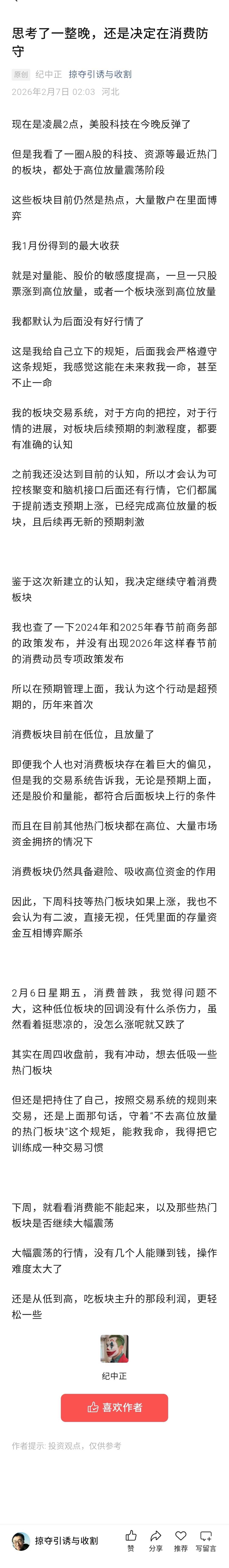思考消费和科技比对了一整晚,还是决定在消费防守