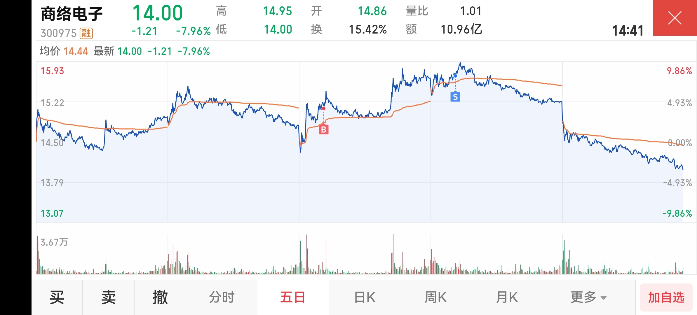 $商络电子(SZ300975)$ 周三买的,昨天看着板块都涨疯了,它才一个多点,赚四个多点抓紧丢掉了,没想到跌这么惨,心有余悸啊