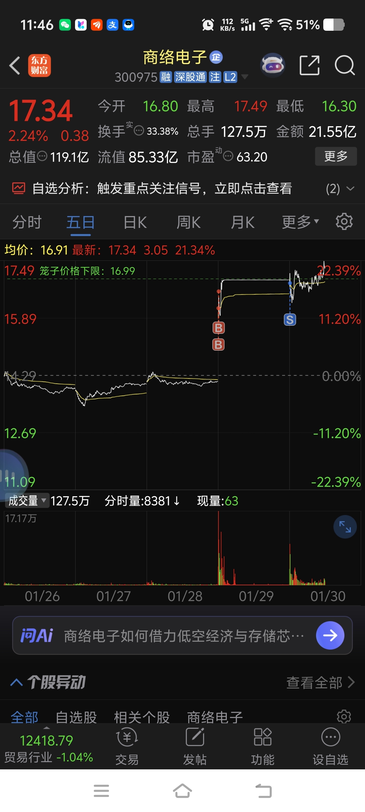 $商络电子(SZ300975)$ 昨天一开始挂买湖南黄金,根本买不到,等我撤单再来买,哗啦哗啦往上冲,我撤了几次,最终在高点一买就不涨了,当时心里那个后悔呀,这种错误不知道犯犯了多少次。我的集合竞价就买进去,我今天我可以不卖,昨天想套我,我去你的。