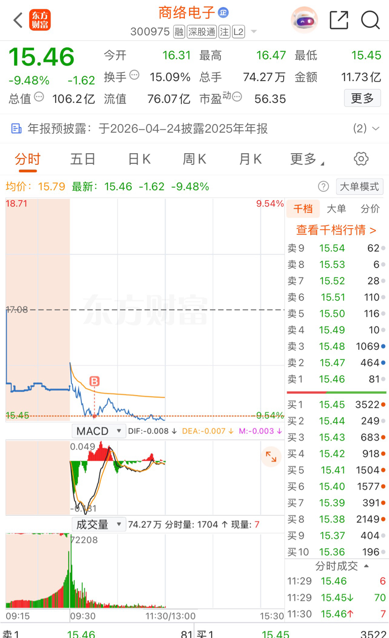 $商络电子(SZ300975)$ 15.5进的,半仓明天跌再买,今天就这样,吃饭睡觉打豆豆。