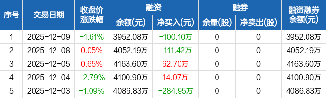 深圳瑞捷:融资净偿还100.1万元,融资余额3952.08万元(12-09)