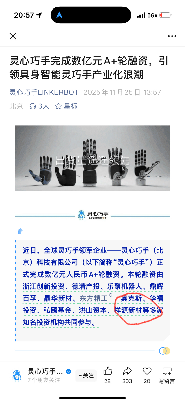 $祥源新材(SZ300980)$ 人形机器人行业灵巧手独角兽企业灵心巧手完成融资,祥源参与投资,结合近期获得电子皮肤专利,形成了“基材--电子皮肤功能材料--灵巧手整机”的完整布局,新兴业务即将起飞。叠加传统业务产能释放与海外高端客户拓展,安全边际突出,又有想象空间,近期非理性下跌创造绝佳买点