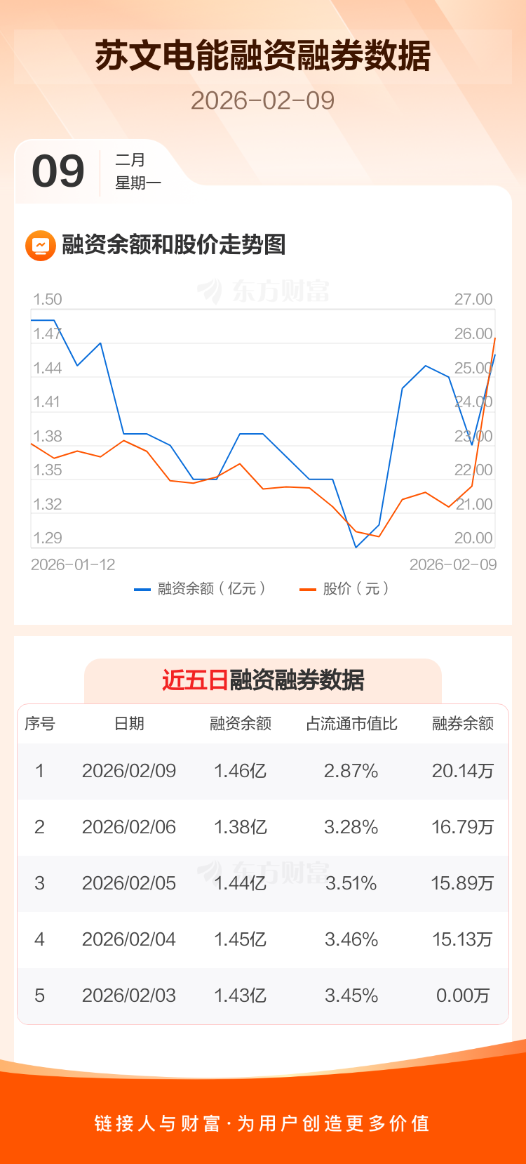 交易所最新数据显示,苏文电能于2026年2月9日获融资买入4354.63万元,融资偿还3641.57万元,当日融资净买入713.06万元。目前,该股融资余额1.46亿,占流通市值比例为2.87%。