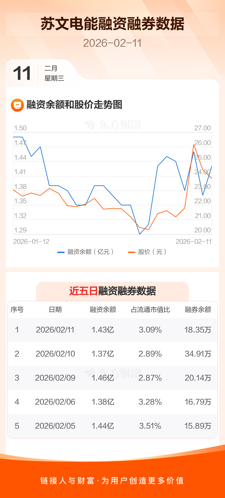 交易所最新数据显示,苏文电能于2026年2月11日获融资买入2607.05万元,融资偿还2028.65万元,当日融资净买入578.4万元。目前,该股融资余额1.43亿,占流通市值比例为3.09%。