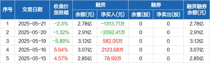 金沃股份:融资净偿还1313.71万元,融资余额2.78亿元(05-21)