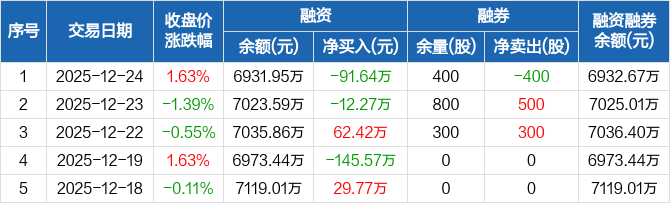 致远新能:融资净偿还91.64万元,融资余额6931.95万元(12-24)
