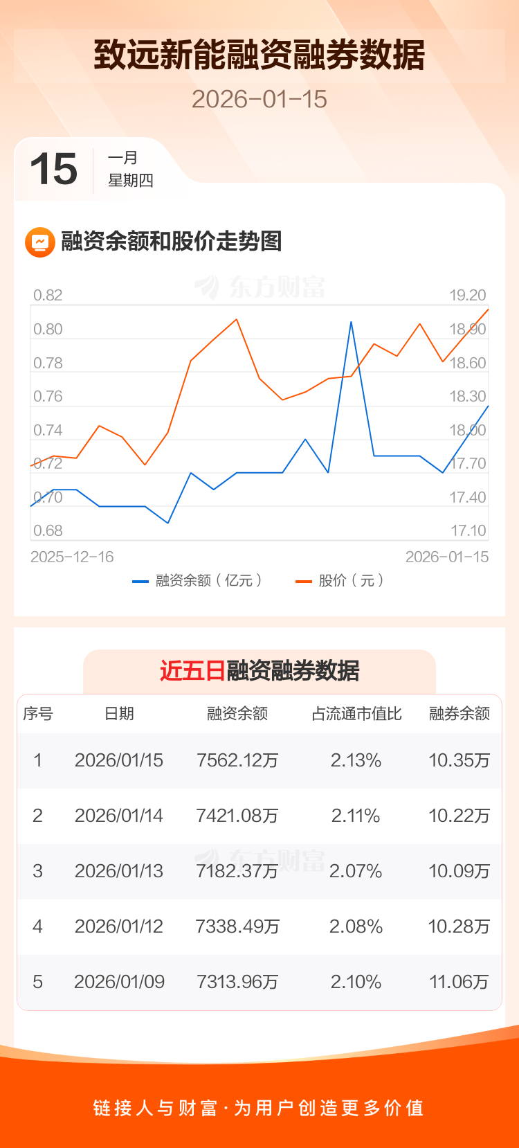 交易所最新数据显示,致远新能于2026年1月15日获融资买入960.54万元,融资偿还819.50万元,当日融资净买入141.04万元。目前,该股融资余额7562.12万,占流通市值比例为2.13%。
