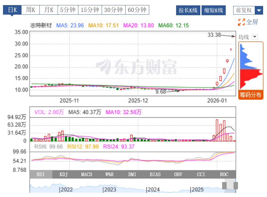 1月12日晚间,江西志特新材料股份有限公司(以下简称“志特新材”,300986.SZ)发布公告称,公司股票自2026年1月5日至1月12日连续6个交易日涨停,涨幅为198.57%,股价波动较大。为维护投资者利益,公司将就股票交易波动情况进行核查。经申请,公司股票自1月13日开市起停牌,预计停牌时间不超过3个交易日。公司提醒投资者注意二级市场交易风险。