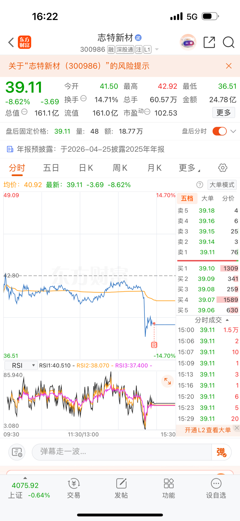 昨天我就说了,通宇通讯前天30 e成交主力吃了十个e,昨天没有涨停就是走弱,志特新材昨天也跑了上涨乏力,要调整