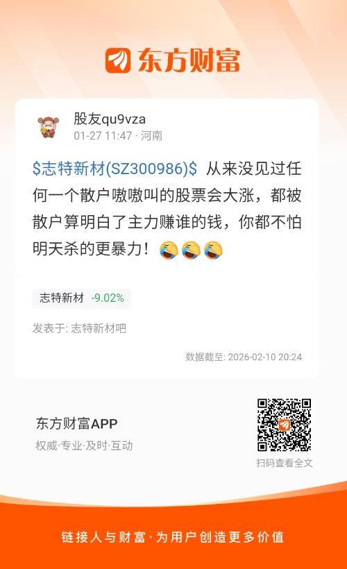 $志特新材(SZ300986)$ 从来没见过任何一个散户嗷嗷叫的股票会大涨,都被散户算明白了主力赚谁的钱,你都不怕明天杀的更暴力!