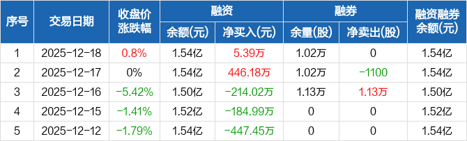 津荣天宇:融资净买入5.39万元,融资余额1.54亿元(12-18)