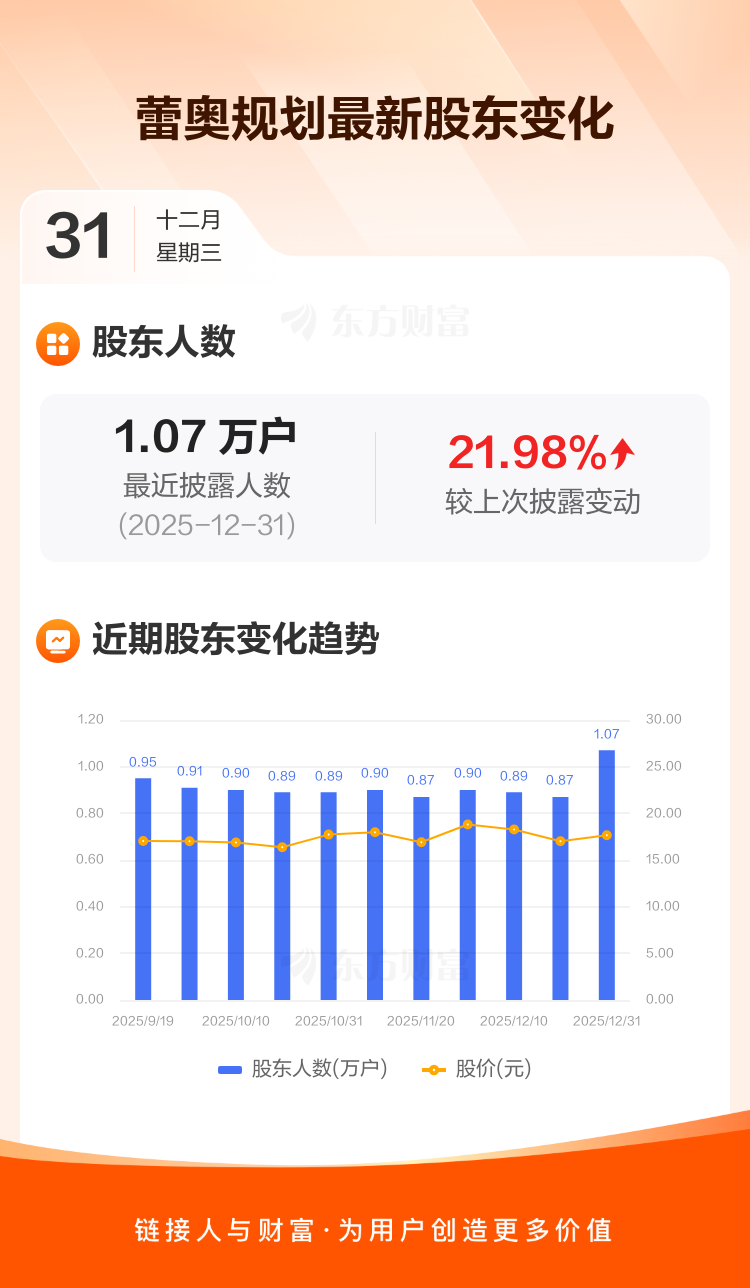 蕾奥规划:截至12月31日最新股东户数1.07万户,较上期增加21.98%