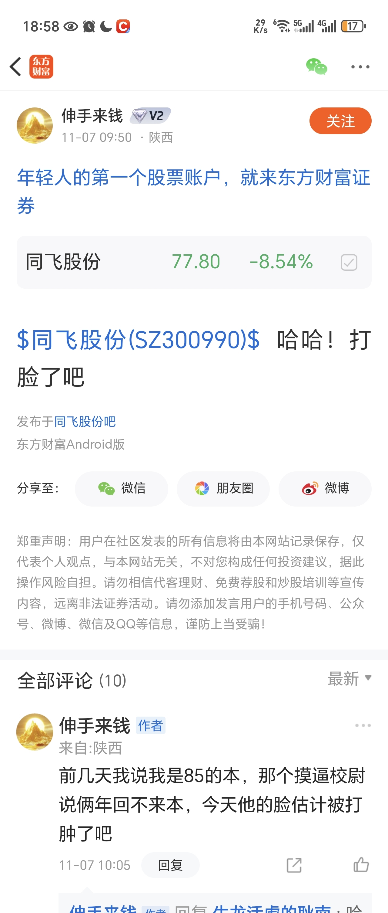 温馨提示: 1.根据《证券法》规定,禁止编造、传播虚假信息或者误导性信息,扰乱证券市场;2.用户在本社区发表的所有资料、言论等仅代表个人观点,与本网站立场无关,不对您构成任何投资建议。用户应基于自己的独立判断,自行决定证券投资并承担相应风险。《东方财富社区管理规定》
