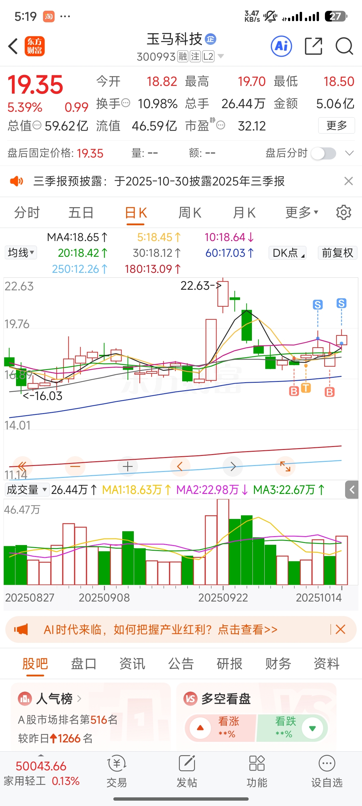 $玉马科技(SZ300993)$ 卖飞了,早盘买点挂低了,一直没有买上,明天等有低点在接回来。