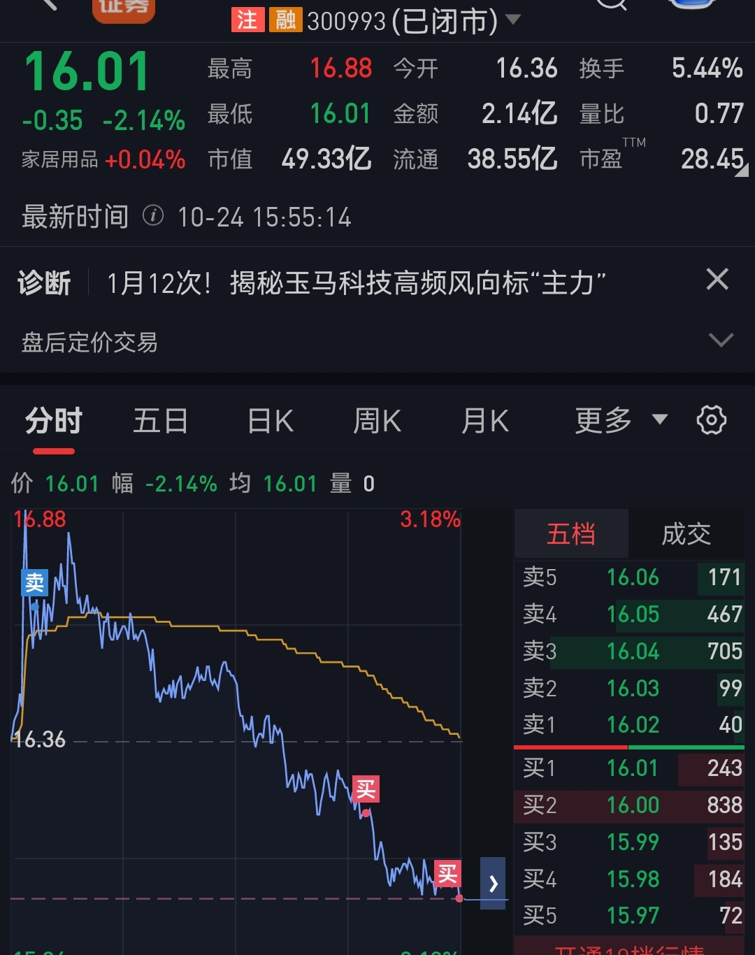 $玉马科技(SZ300993)$ 所有技术指标均已恶化,昨天正式跌破季线,今天反弹无力,惋惜玉碎之余,上午借小反弹清仓离场。