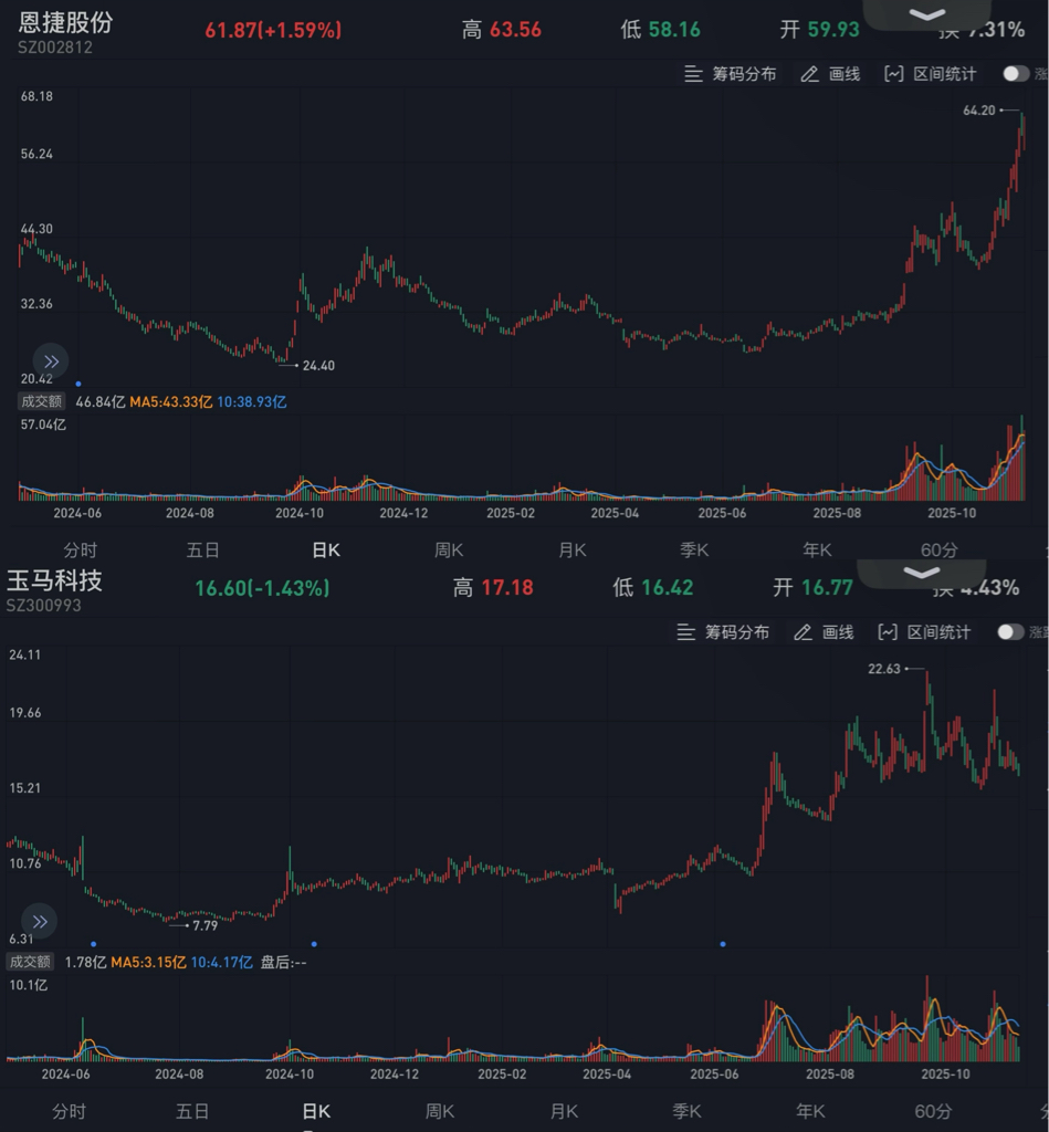 对比PVDF的头部企业恩捷的走势,可以看出玉马大体趋势是类似的,所以大家拿好手里