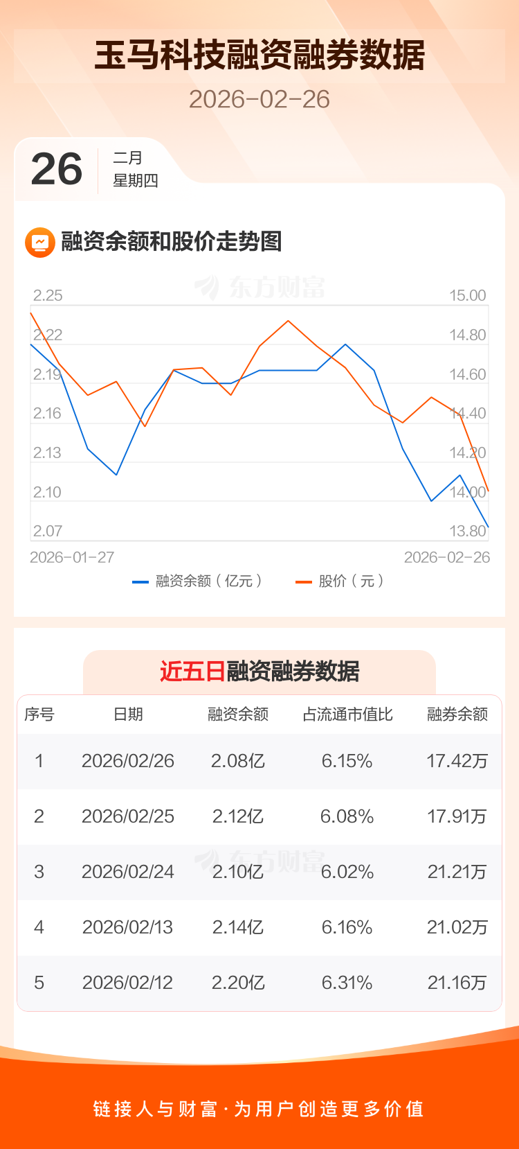 交易所最新数据显示,玉马科技于2026年2月26日获融资买入913.75万元,融资偿还1253.44万元,当日融资净偿还339.69万元。目前,该股融资余额2.08亿,占流通市值比例为6.15%。