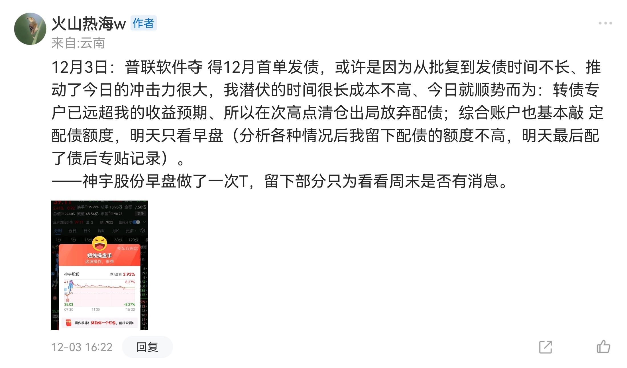 ——$普联软件(SZ300996)$我的转债专户是9月23日开始潜伏的(综合账户是10月10日~附图是综合账户潜伏交易图)。12月3日发债公告后的强势上冲,我顺势而为:转债专户最后一单以次高点20.88元、均价20.67元全部清仓出局放弃配债;综合账户昨日已基本敲 定留50手、今日尾盘补 8手凑足可以配债50张以弥补不能中签的念想。之所以转债专户放弃配债、综合账户也只配债50张:一是潜伏长、正股收益已超预期(特别是转债专户的收益远远超过了综合账户的收益);二是此股第一股东前期减持、在我看来这是有意放弃配债、他都放弃我会配多吗?(关于第一股东减持之事,我看股吧常常发转债帖子的几个大V都“忽略”了这个问题)。$普联转债(SZ123261)$