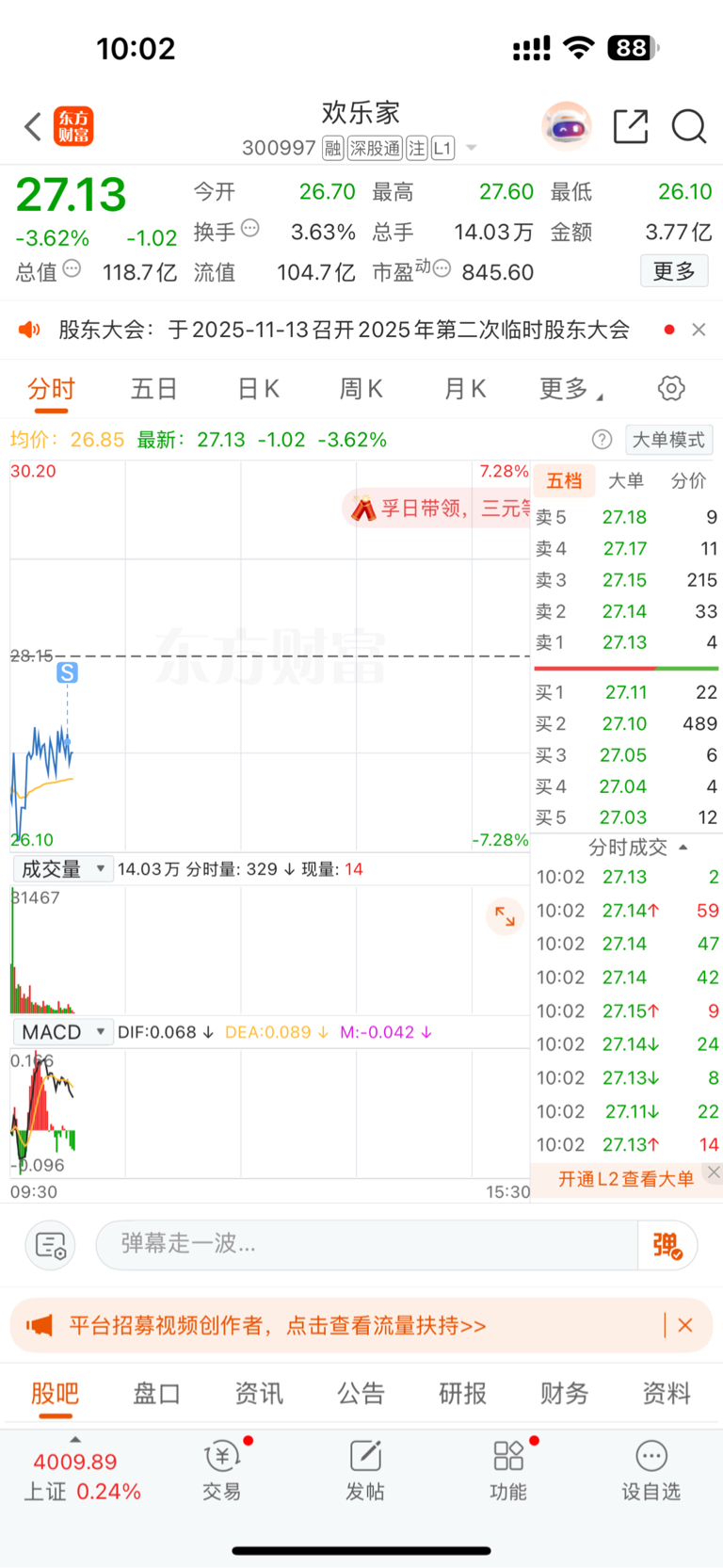 $欢乐家(SZ300997)$ 昨天最高位没离场,今日稍有回调,但前面两天的拉涨,依然吃肉,见好就收,落袋为安。
