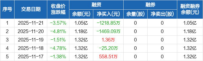 融资方面,当日融资买入1730.95万元,融资偿还2949.8万元,融资净偿还1218.85万元。融券方面,融券卖出0股,融券偿还0股,融券余量0股,融券余额0元。融资融券余额合计1.05亿元。