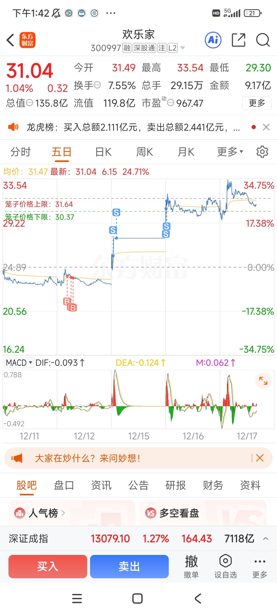 $欢乐家(SZ300997)$ 早盘冲高都卖,今天格局一把就下来了,只能等明天早盘了
