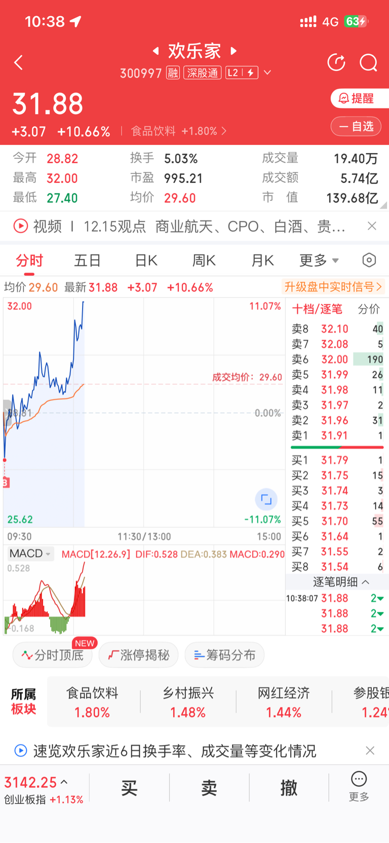 $欢乐家(SZ300997)$ 昨天挂的下杀单,今天一看居然成交了。感谢主力早盘把股价打了下来,不然我还真进不来。