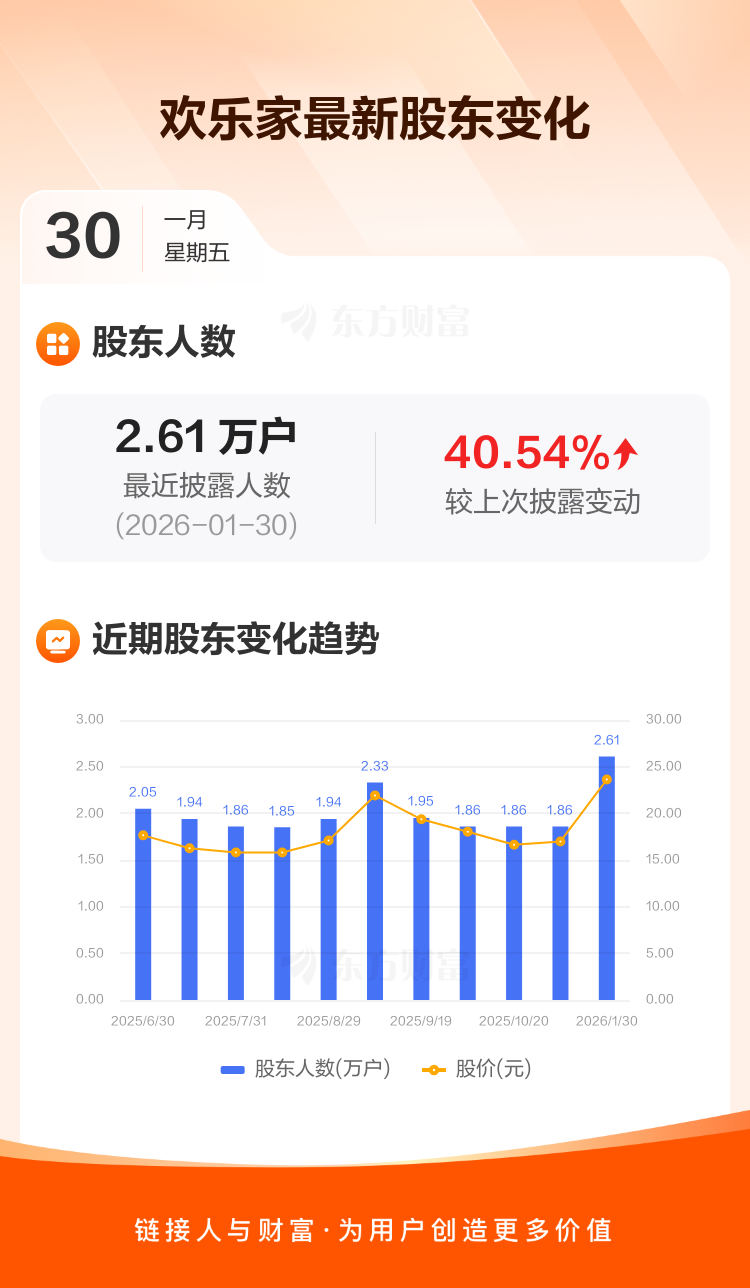 欢乐家:截至1月30日最新股东户数2.61万户,较上期增加40.54%