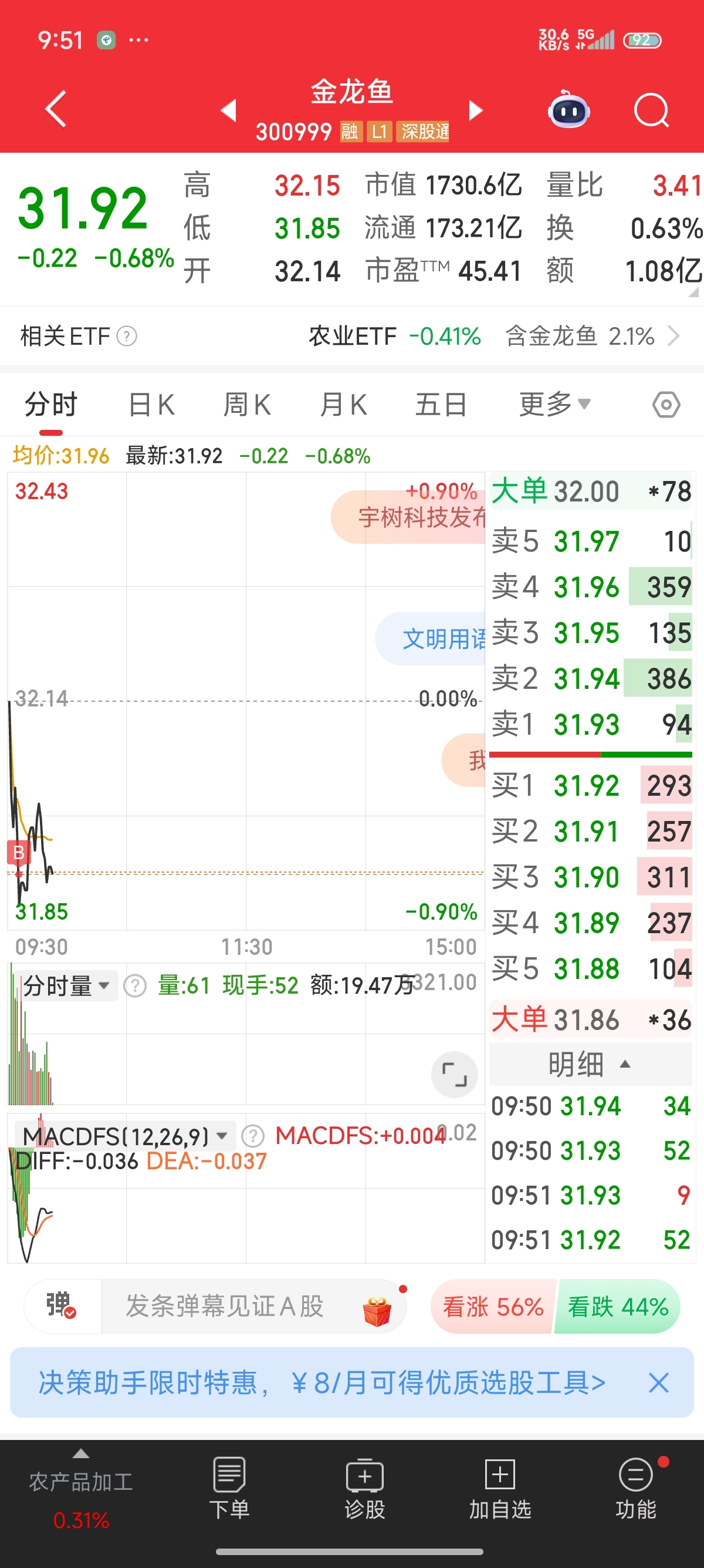$金龙鱼(SZ300999)$ 开盘买了一丢丢金龙鱼!